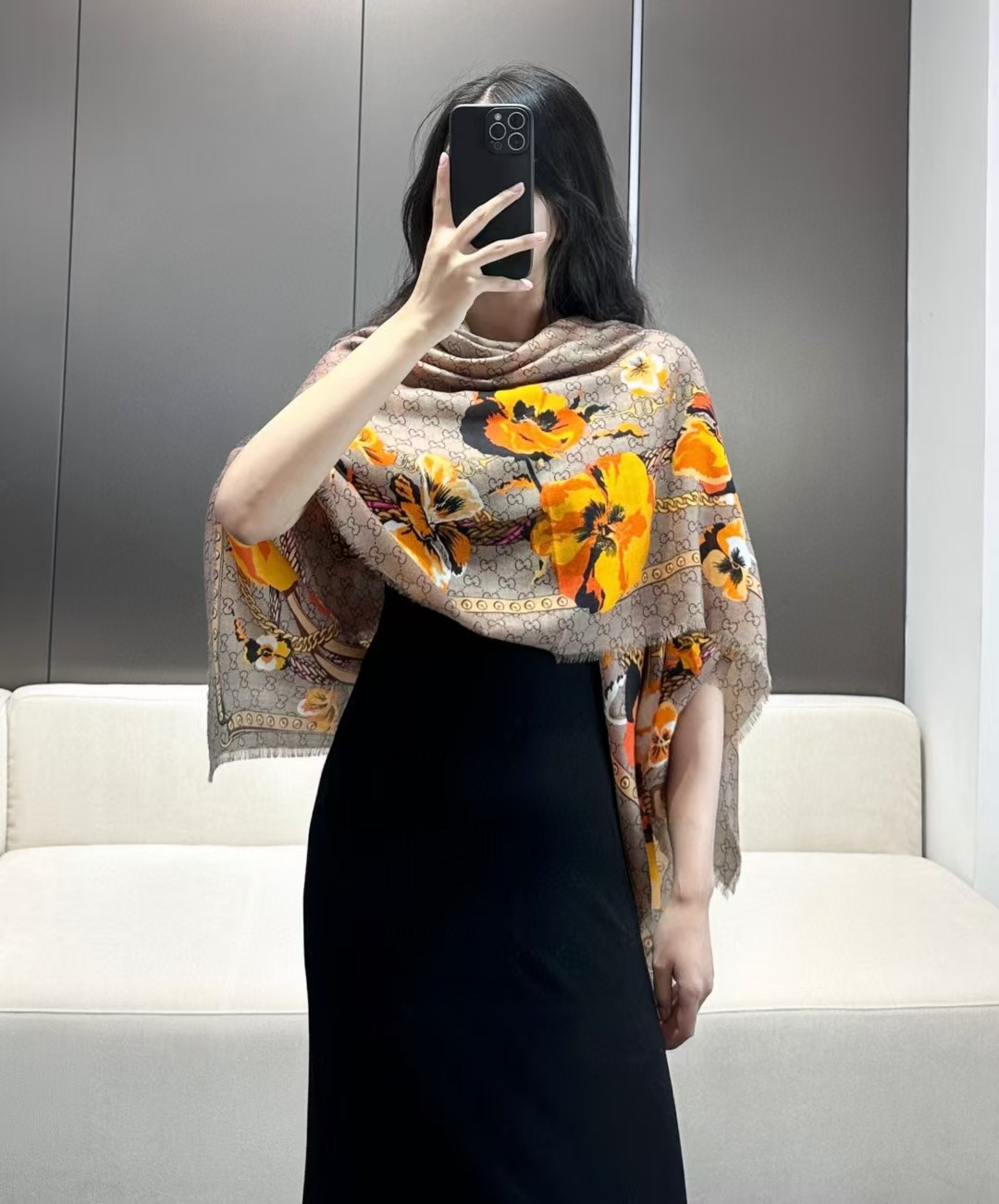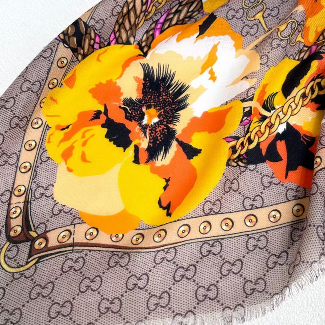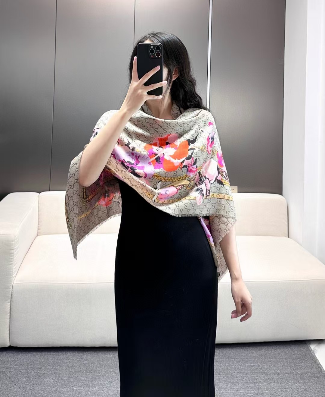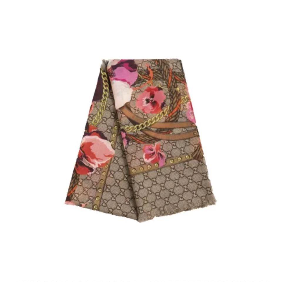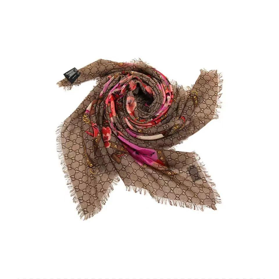 【介绍】Gucci经典的双G字母Logo配上花卉元素,由内到外渗透出来的气质!骨子里的时髦感,抬人的围巾,羊绒毛的材质,紧密柔软,相当有高级感,舒适得不行!自留款,就爱这样的配饰,时髦,有自己的感觉,这件披肩完全不挑年龄,我身边的各年龄层的都喜欢死了,都说要留一件,好看又大牌,又有着恰到好处的女人味,非常非常好看!!上身反正就是气质慢慢的渗透,蔓延出来。